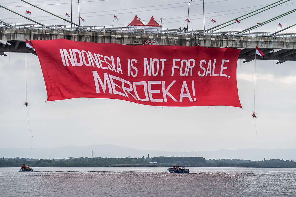 Aktivis Greenpeace membentangkan banner saat aksi damai kreatif di Jembatan Pulau Balang, Kalimantan Timur