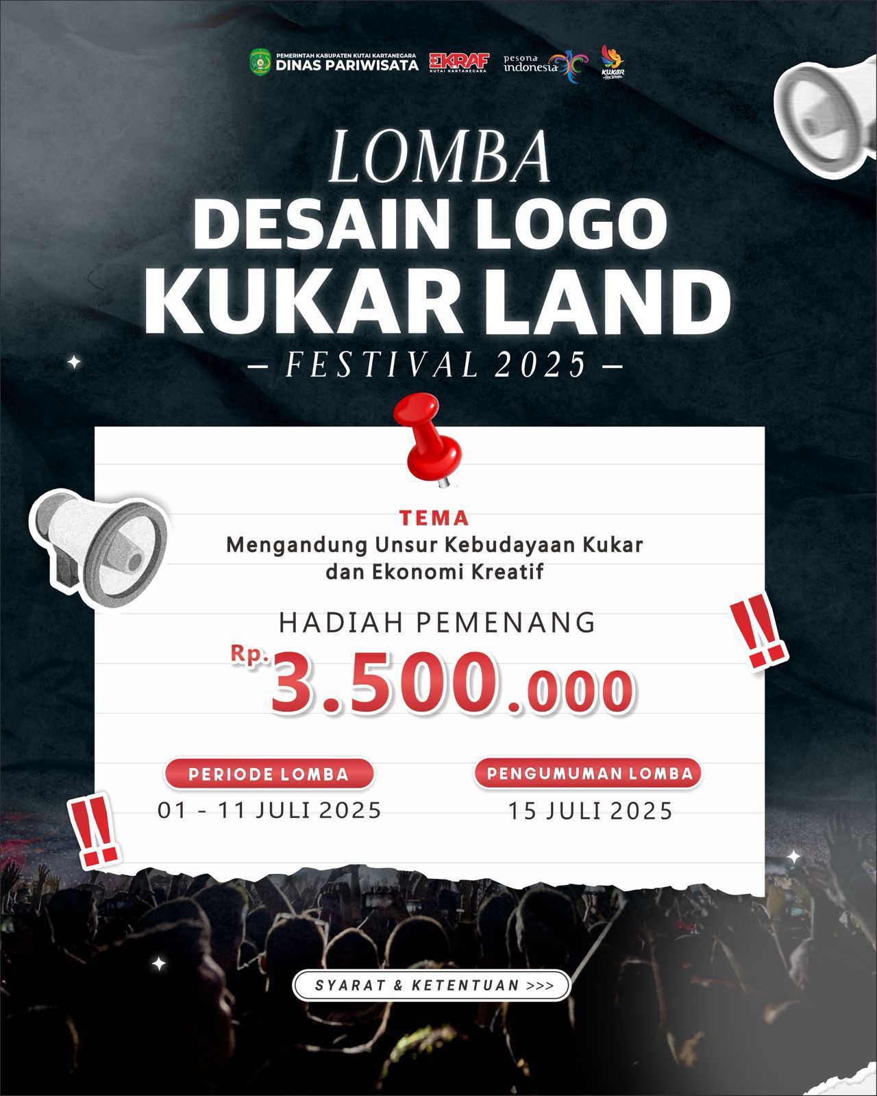 Bagi masyarakat Kukar yang memiliki kreativitas dan semangat untuk ikut memajukan pariwisata serta ekonomi kreatif daerah, inilah saatnya untuk terlibat langsung. Tunjukkan ide dan imajinasi terbaik Anda dalam desain logo Kukar Land 2025. Jadilah bagian dari wajah baru festival kebanggaan Kukar! (adv/Dinas pariwisata Kukar)